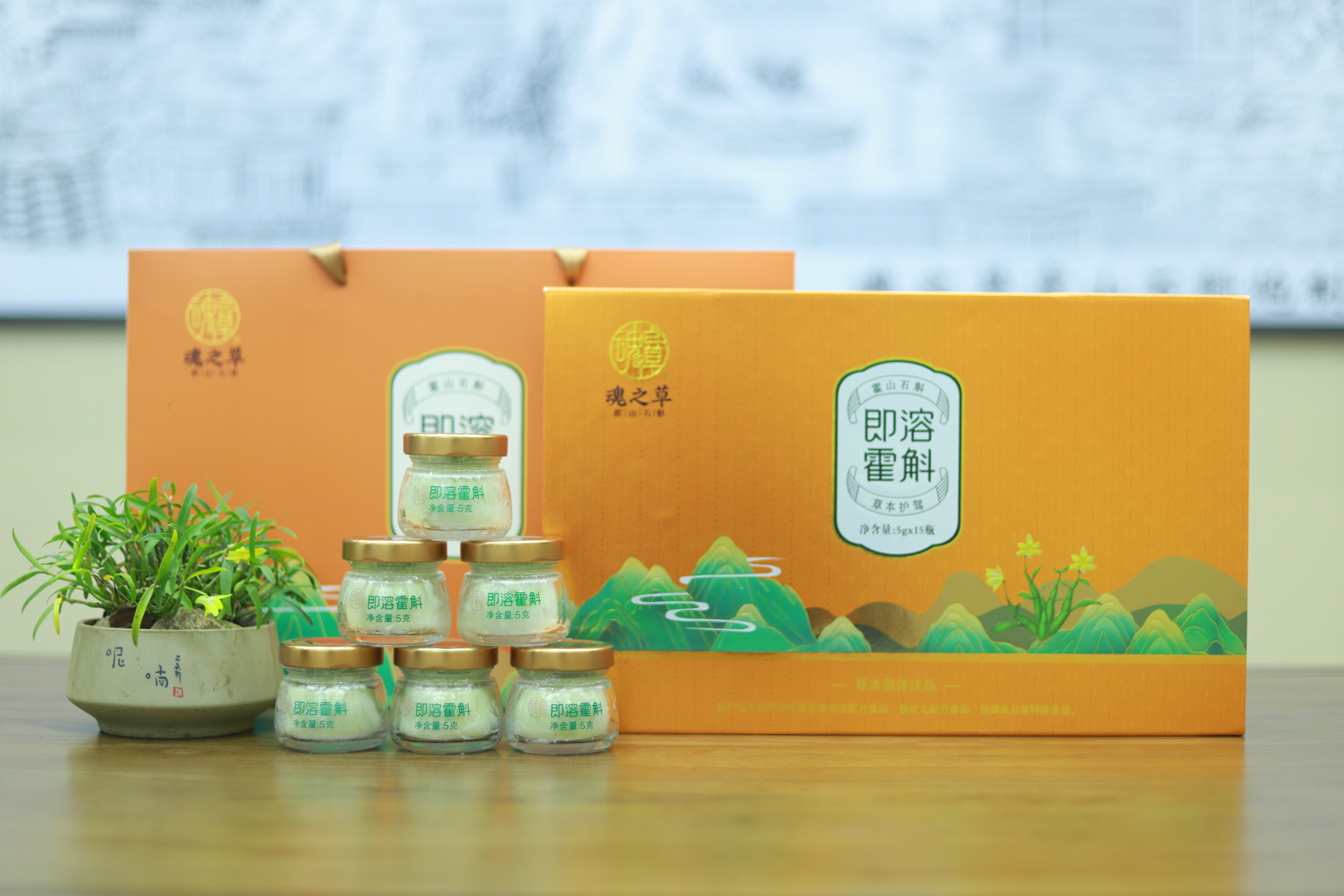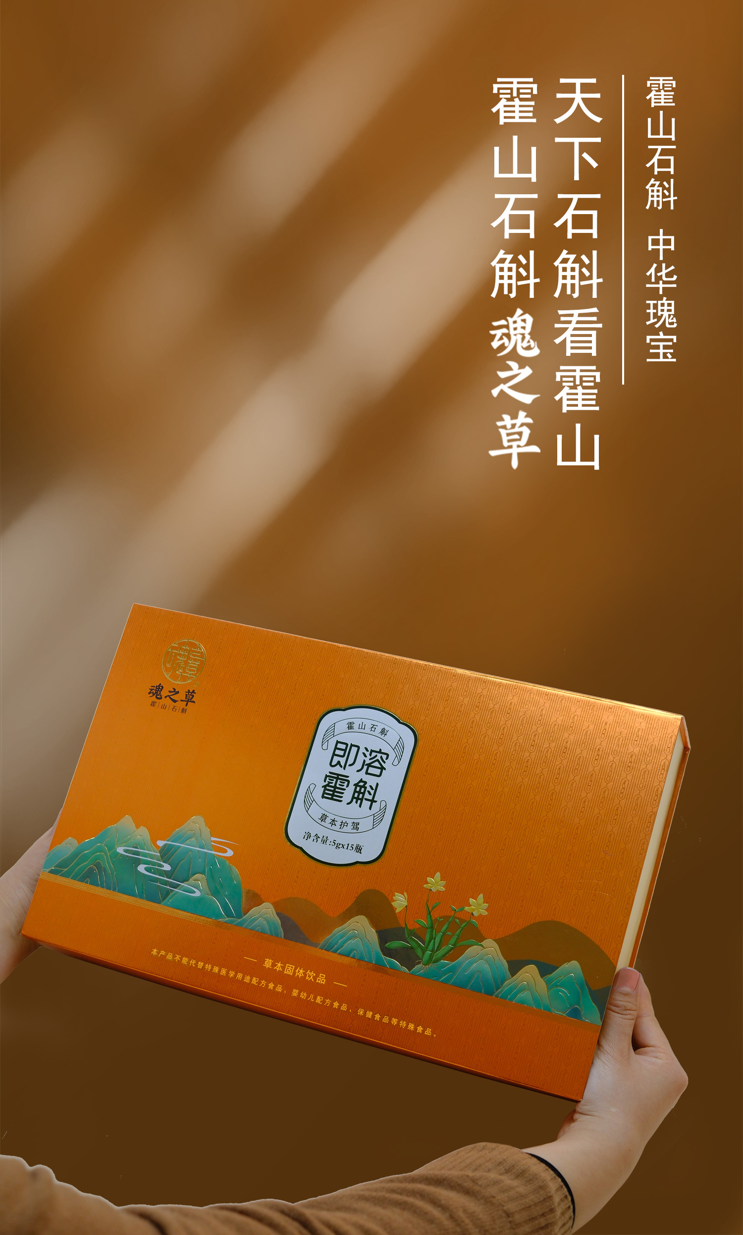 魂之草即溶霍斛精美礼盒以暖橙黄为主色调,搭配烫金工艺与简约流线设计,宛如一缕温暖阳光,传递出温馨、关怀与吉祥的寓意。无论是赠予长辈表达孝心,或是送客户彰显诚意,都是体面又贴心的健康好礼。家庭装每瓶5克,共15瓶的规格设计,自带饮用方便,宴客分享亦显大方。