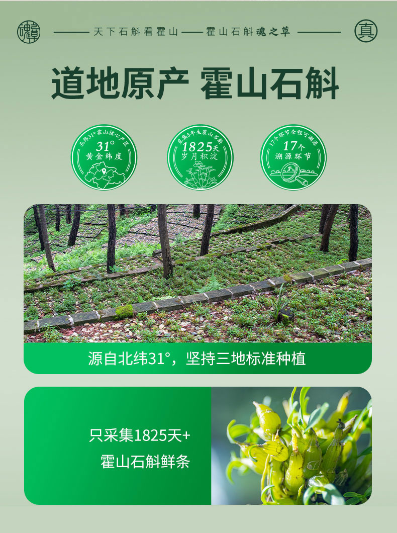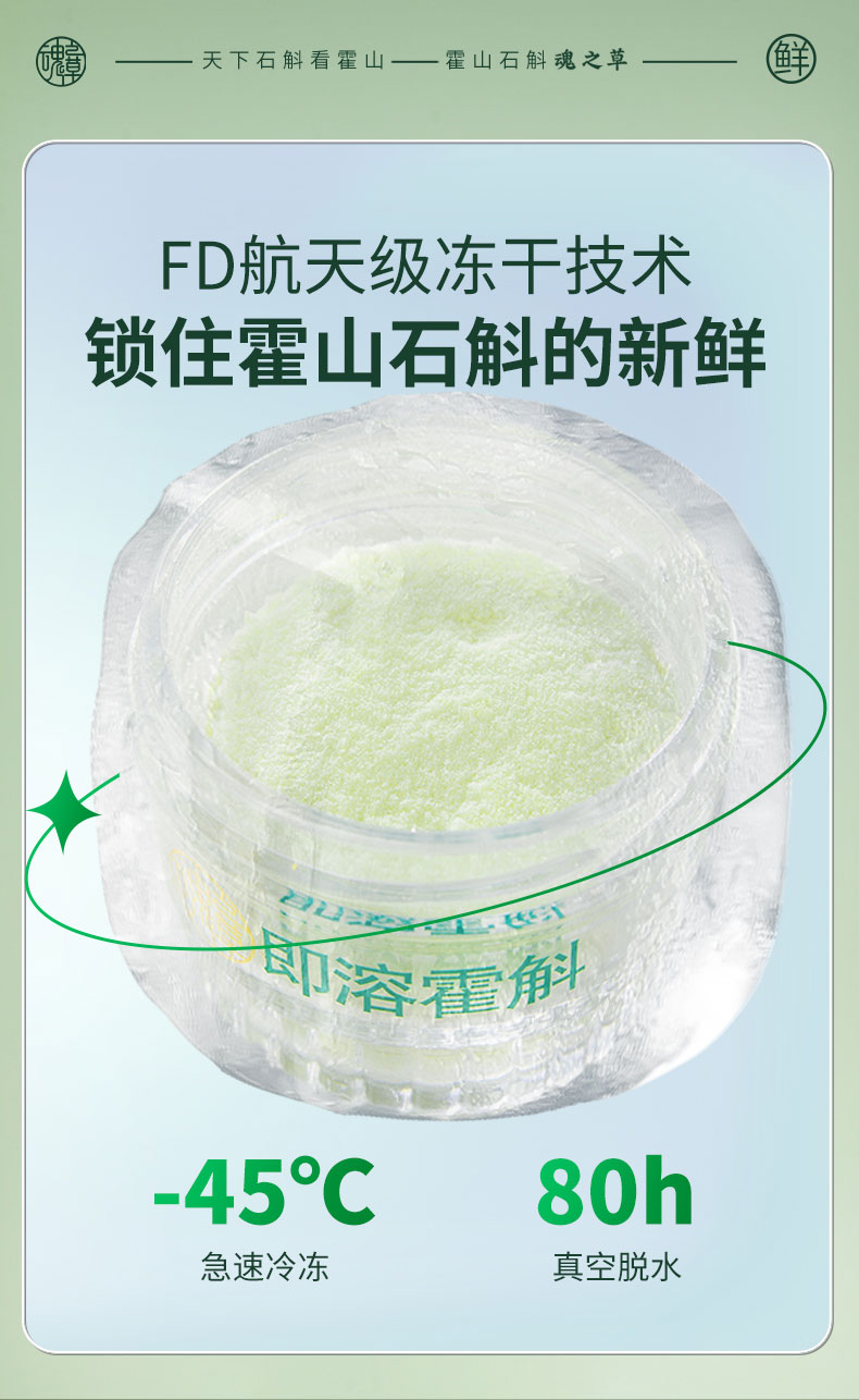 魂之草即溶霍斛精选道地霍山石斛为原料,鲜榨萃取后采用FD冻干技术,完美保留了霍山石斛中的活性成分与珍贵营养。