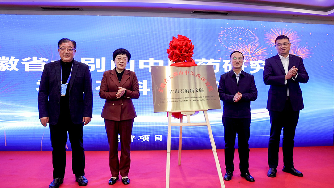 在论坛的重要环节,皖西学院党委书记袁维海、安徽省中医药管理局副局长赵斌、六安市政府副市长魏武、霍山县委常委、常务副县长李传江为安徽省大别山中医药研究院霍山石斛研究院揭牌。