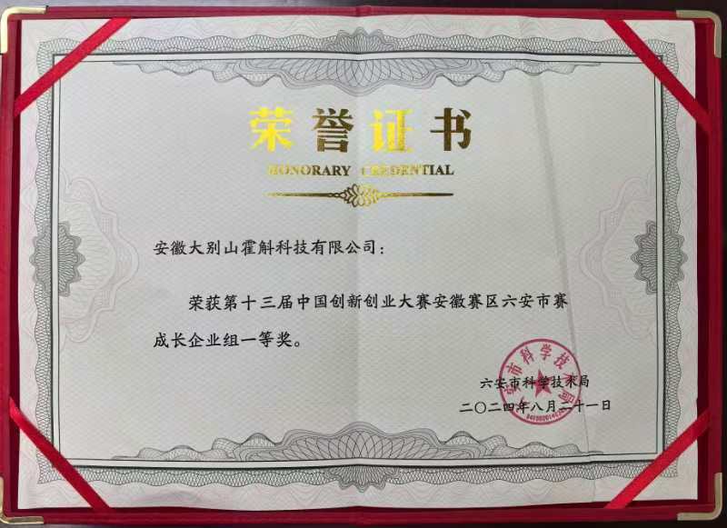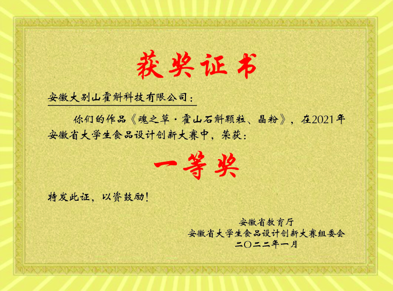 在科技创新领域,霍斛科技始终引领行业发展。作为霍山石斛草本固体饮品的开创者,公司主导制定了该领域的生产标准,荣获“安徽省新产品证书”。此外,还先后斩获霍山县第二届 “创享霍斛” 农商行杯乡村振兴创业创新大赛决赛一等奖、“2024 年度安徽省食品行业科技创新企业” 称号、即溶霍斛获第六届中国创翼创业大赛三等奖、“安徽省大学生食品设计创新大赛一等奖” 等多项荣誉。