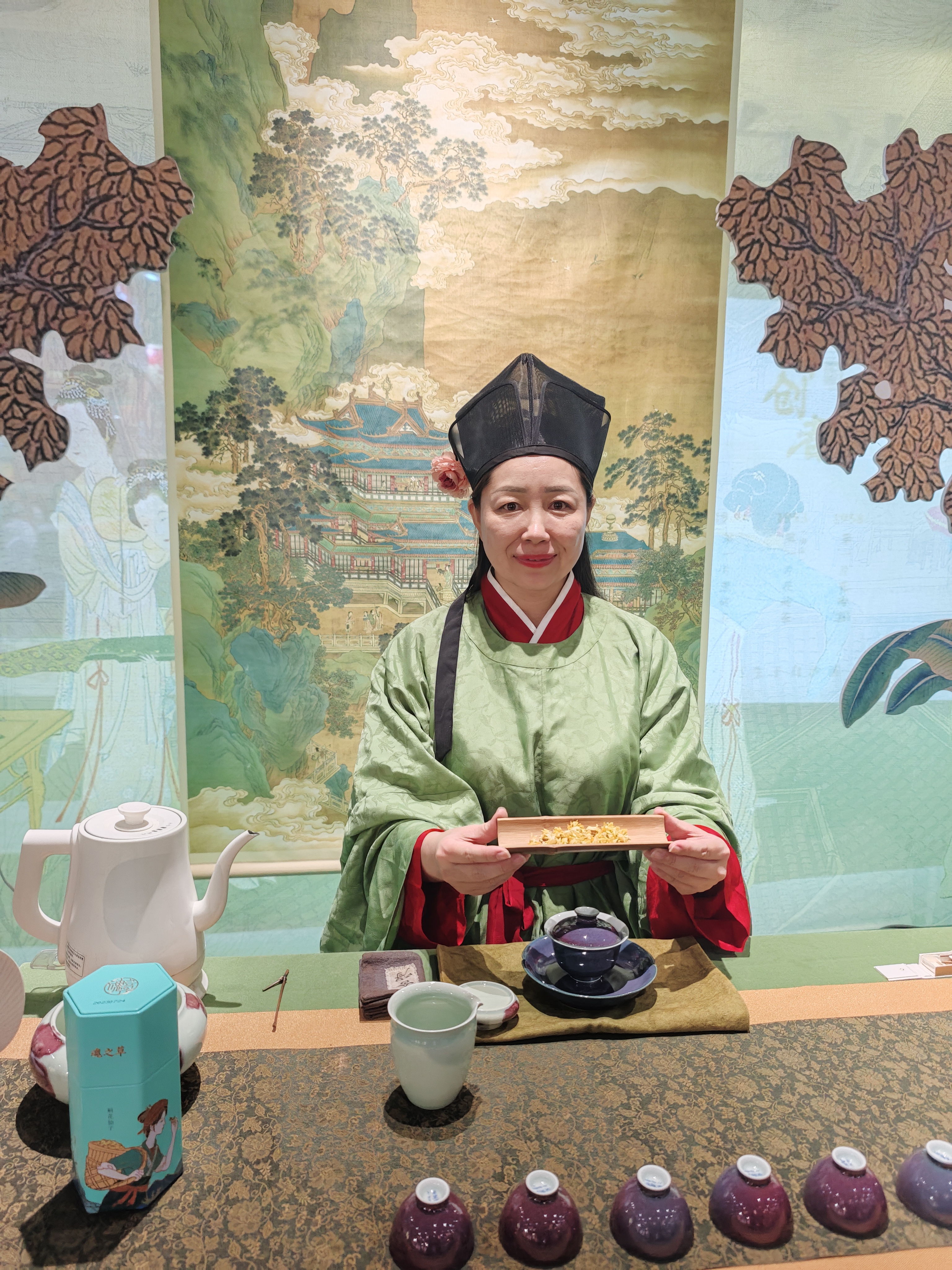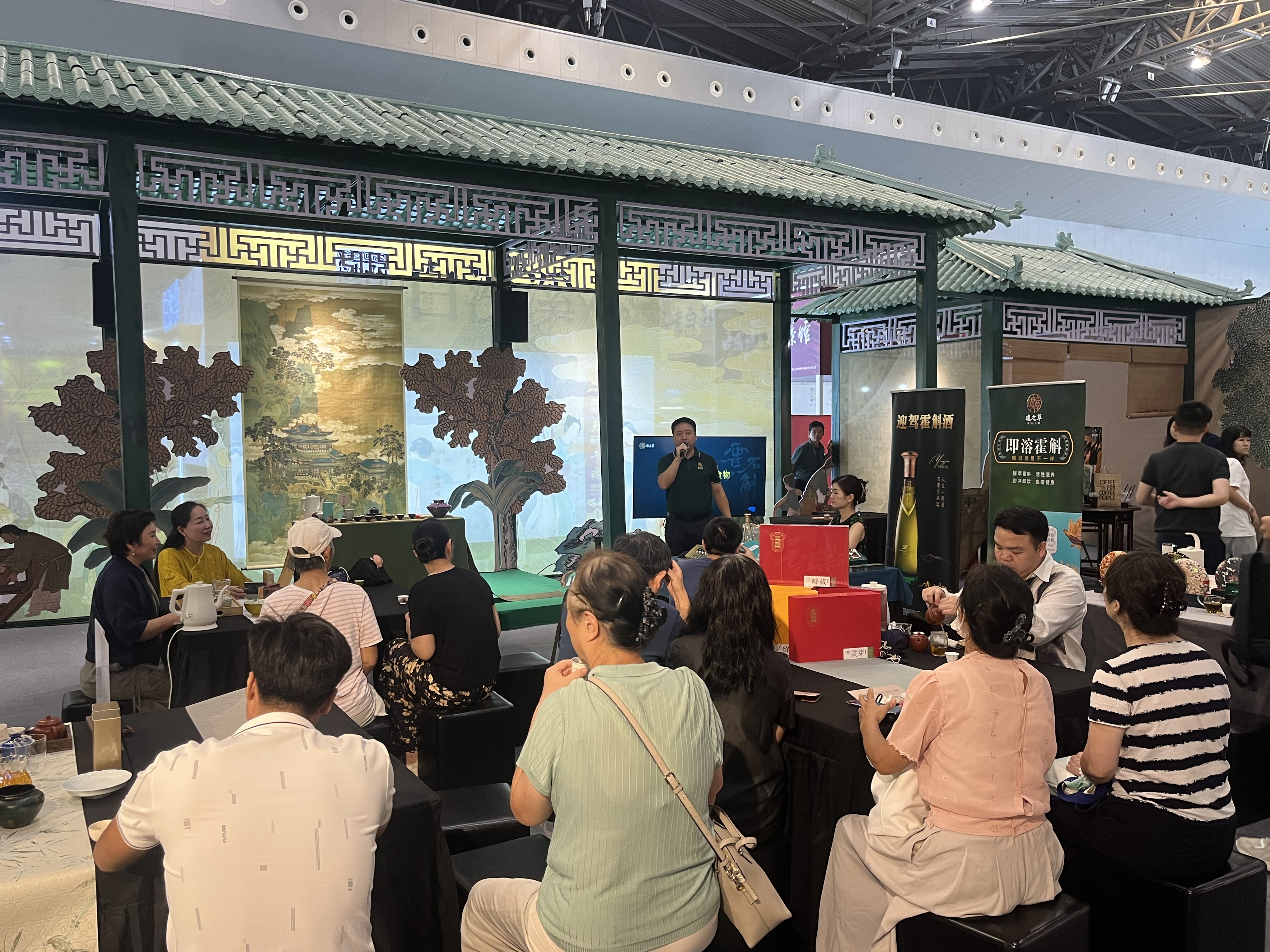 展位设计以山溪畔的品茗意境为蓝本,在都市中复现唐宋茶事的悠然。参观者可沉浸式体验从大唐煎茶的古朴到宋代点茶的考究,而"一觞一咏"的仪式感,不仅是茶道的演绎,更是霍斛科技"以斛养身、以茶养心"理念的具象表达。